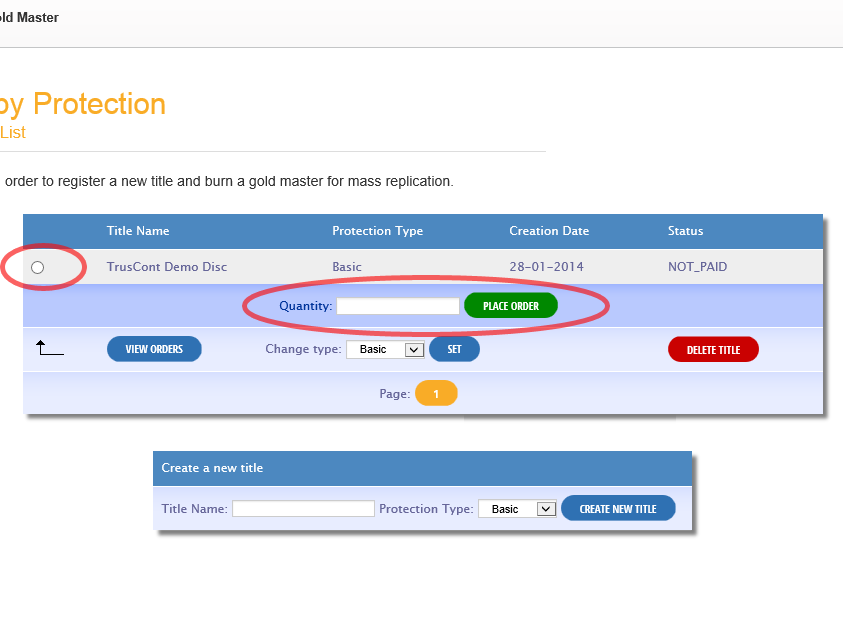 The status of the new title that you have created is 'NOT_PAID'. You now have to place a new order and pay for the copy protection. Select the radio button next to the title name, enter the number of discs that you wish to replicate/protect and then click 'Place order'.